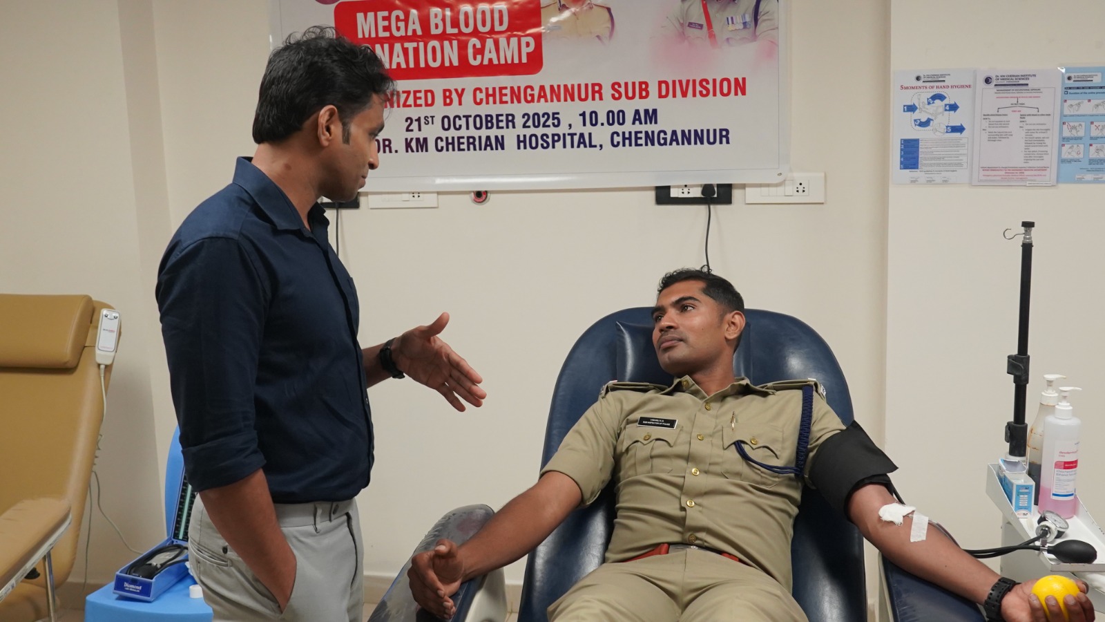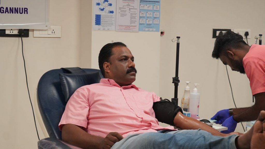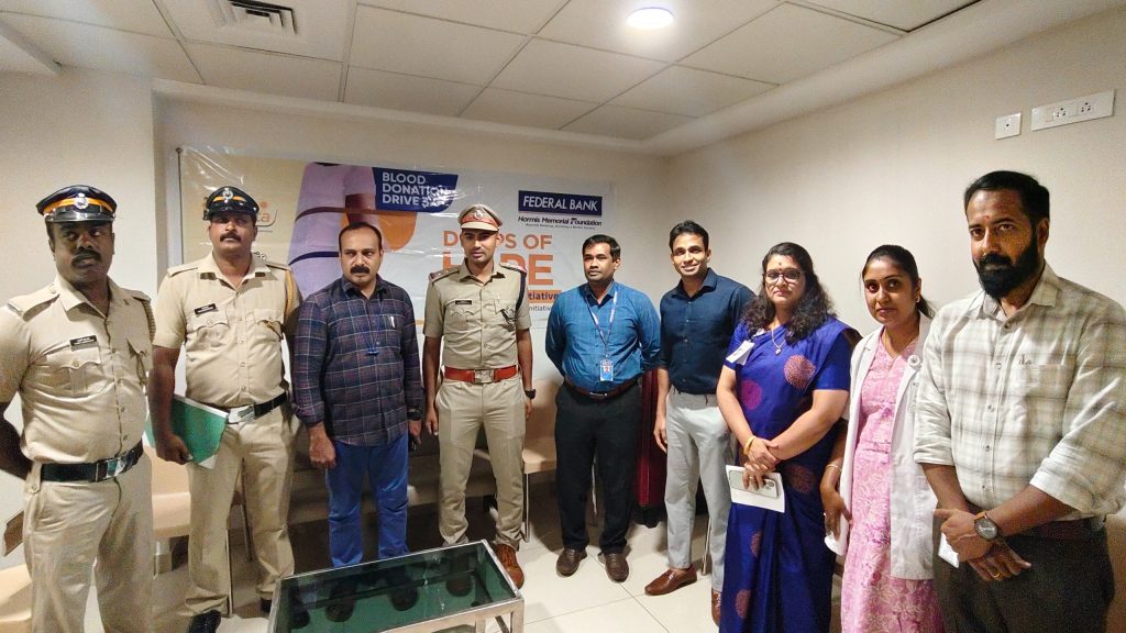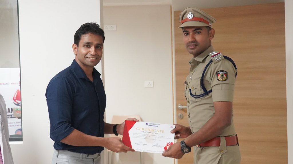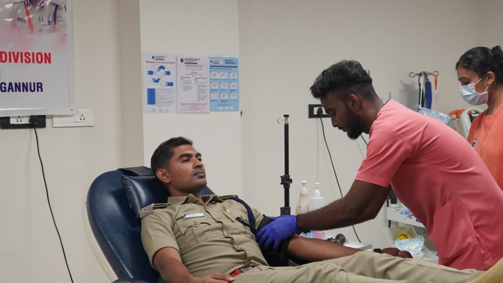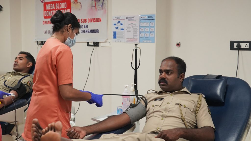 The blood donation drive was inaugurated with the first donation by Shri. Vishnu K. G (SHO, Chengannur Police Station) along with other CPOs. The function was graced by the presence of Dr. Pooja Raghunath (Deputy Medical Superintendent, Consultant Microbiologist, Infection Control Officer & Clinical Quality Coordinator), Dr. Ali Abdul Latheef (Consultant Pathologist) and staff members from various departments.
