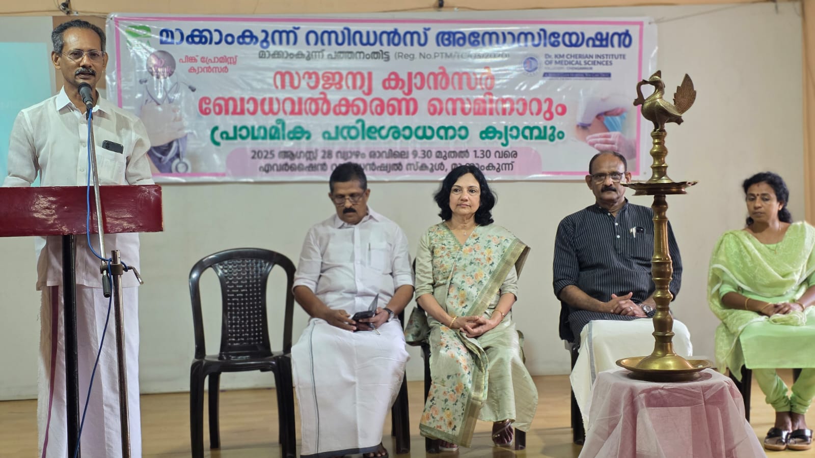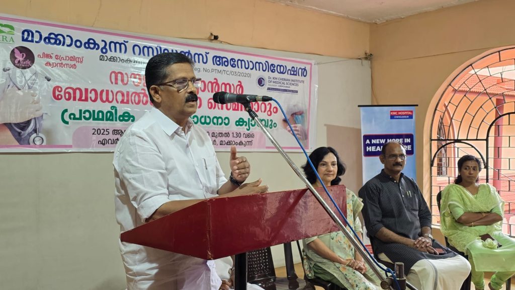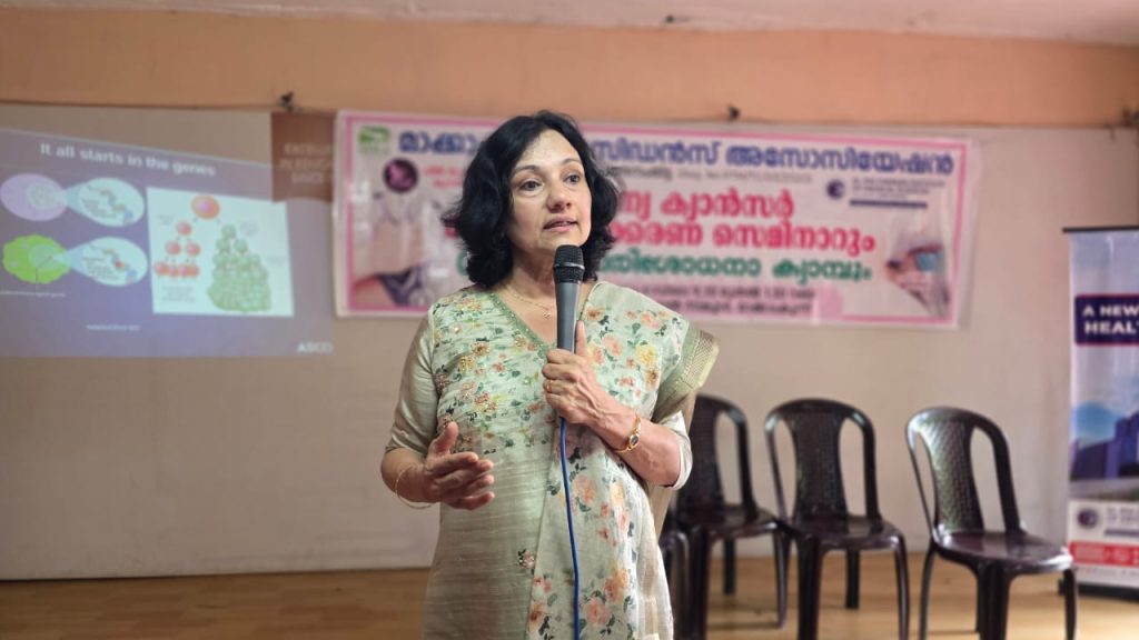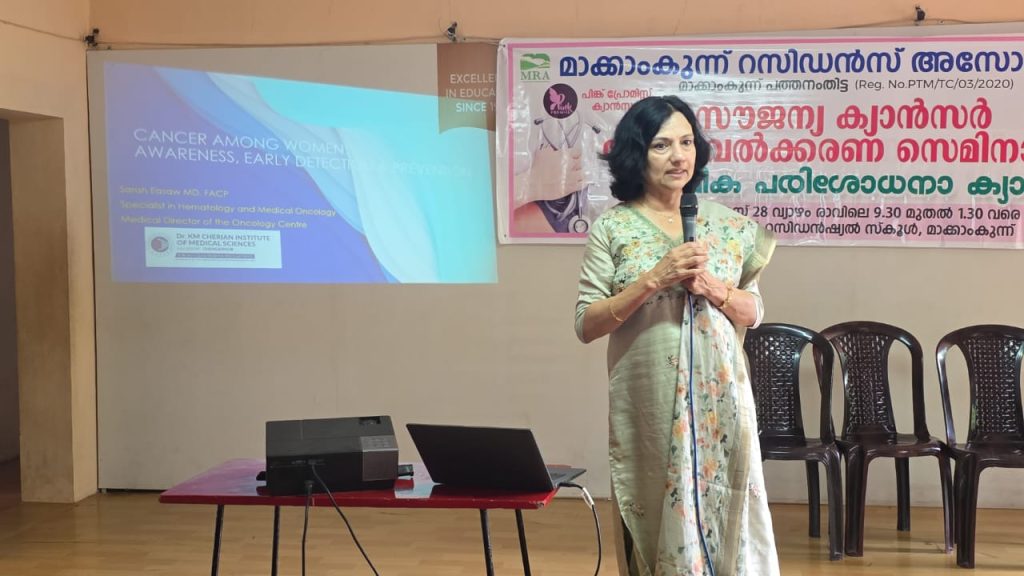 The session was led by Dr. Sarah J. Easaw (Medical Director & Consultant Oncologist, Oncology Centre, KMC Hospital). Mr. K. R. Ajith Kumar (Chairman, Development Standing Committee, Pathanamthitta Municipality) and Mr. Abel Mathew (Secretary, MRA Residents Association) were present.