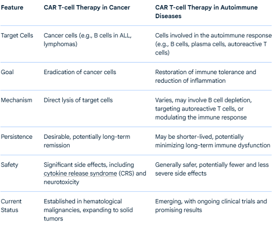 The CAR-T therapy represents a significant advancement in the treatment of autoimmune diseases. Currently, it is being evaluated as a long-term management option due to its effectiveness. This therapy can fundamentally change the immune system responsible for autoimmunity. Unlike cancer treatments, where CAR-T cells remain for an extended period, they are temporarily implanted in patients with autoimmune disease  to reduce the likelihood of side effects, infections, and immune dysfunction.